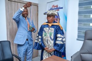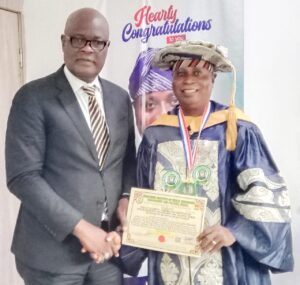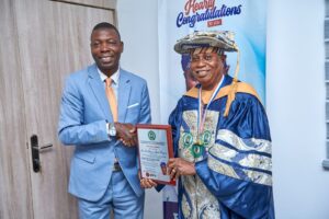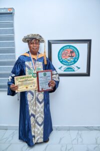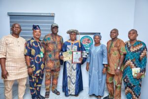 The prestigious honour, which also inducts him into the Institute’s 2026 Hall of Fame, was formally presented during a brief but significant ceremony held at his office in Badagry. The delegation was led by Dr. Babatunde Newton, 2nd Vice-President (Academic), accompanied by Engr. Mike Shey Phillips and Mrs. Victoria Olanrewaju.
